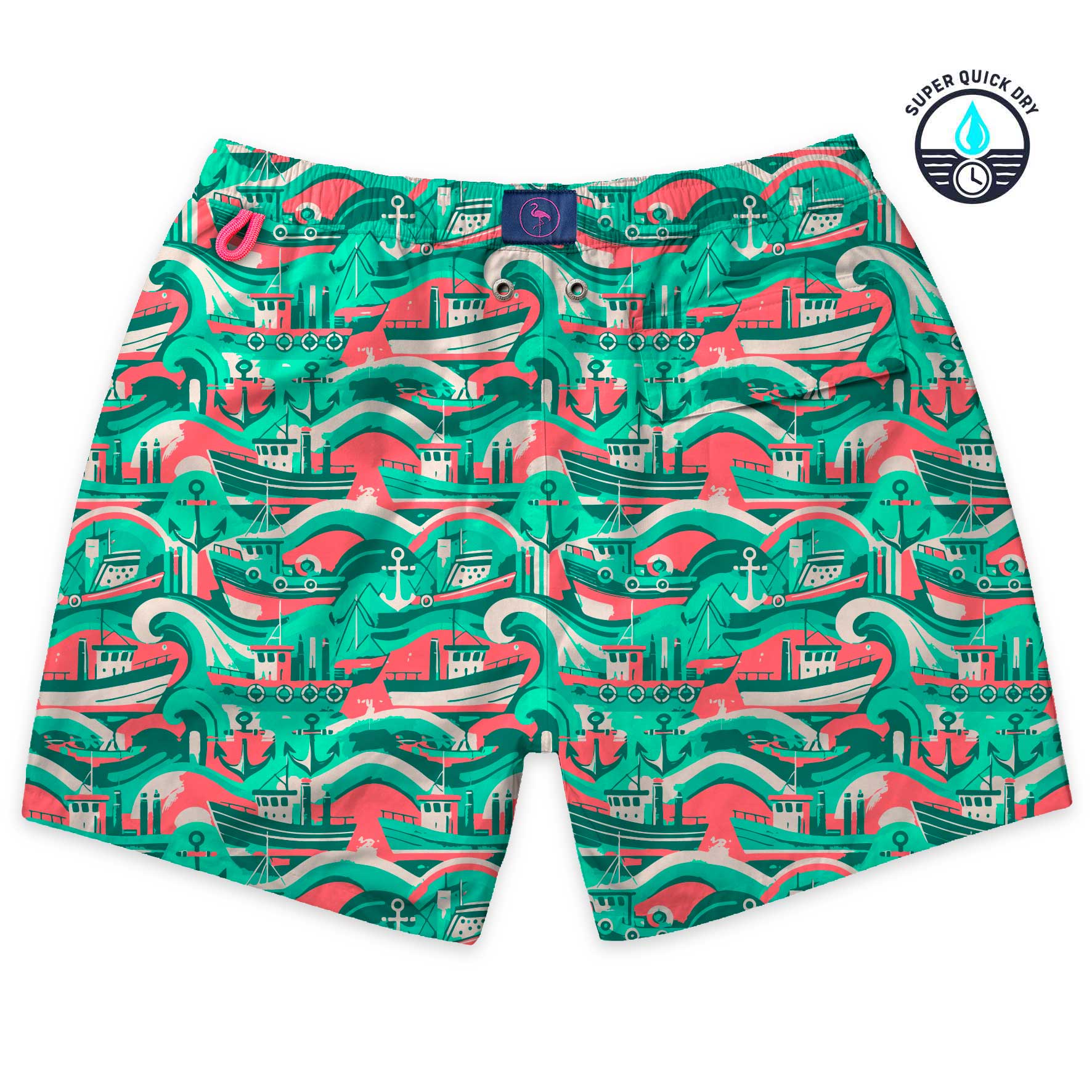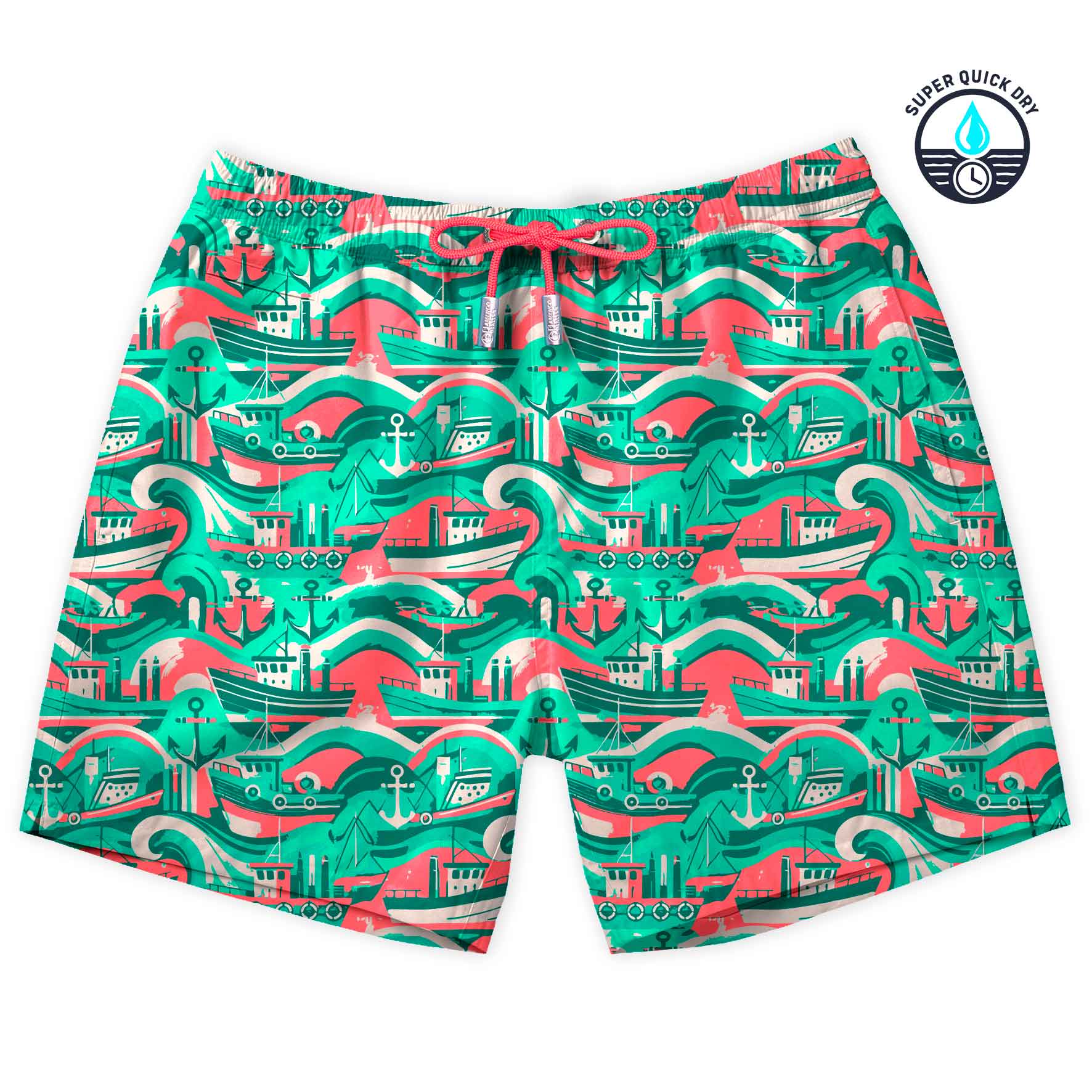 Traje de baño de secado ultra rápido con estampado de mar con barcos y anclas  en tonos verdes, blancos y rojizos.