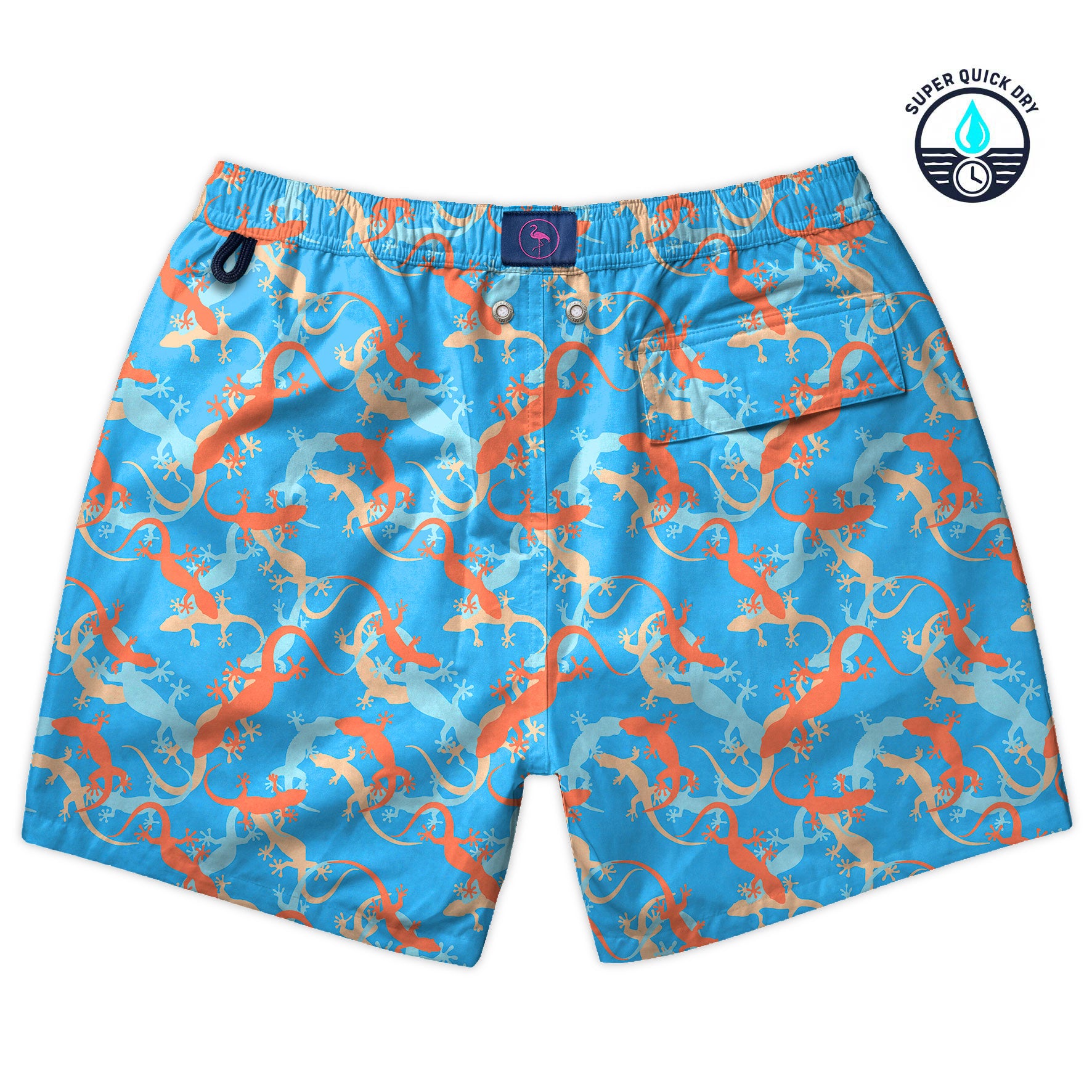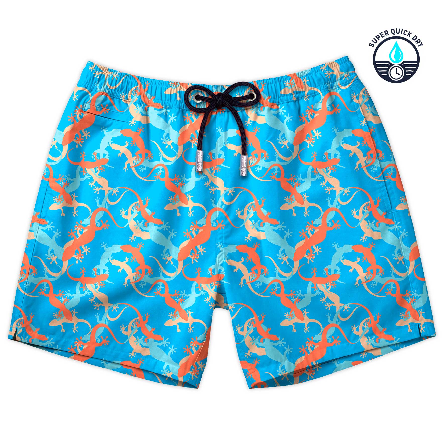 Traje de baño de secado ultra rápido con estampado de salamandras de colores sobre fondo azul. Cuenta con evacuadores de agua y terminales personalizados.