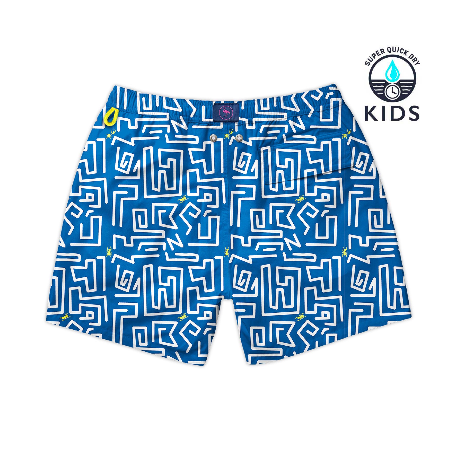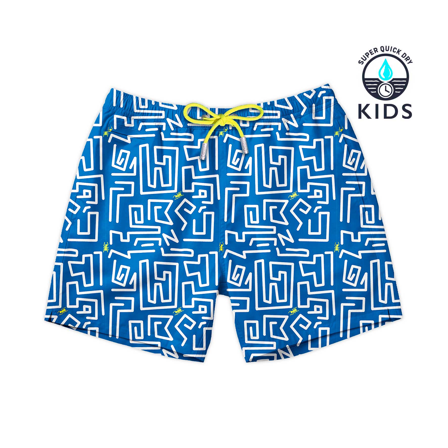 Traje de baño de secado ultra rápido con estampado de laberinto de hormigas amarillas sobre fondo azul.