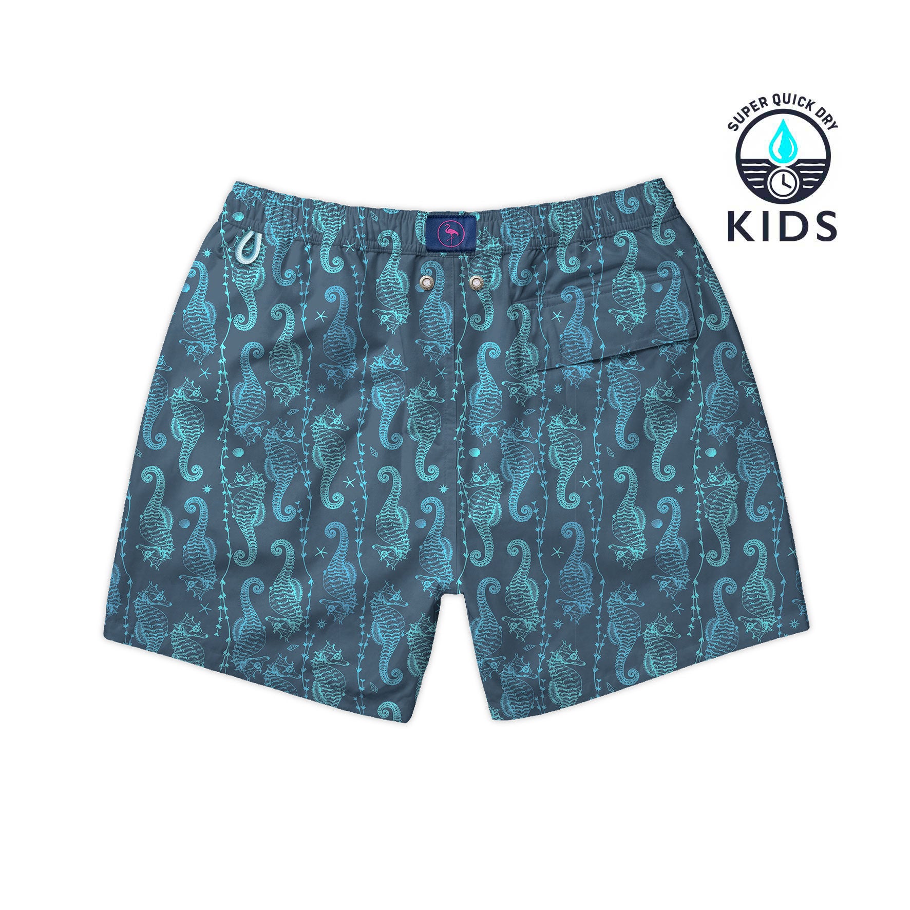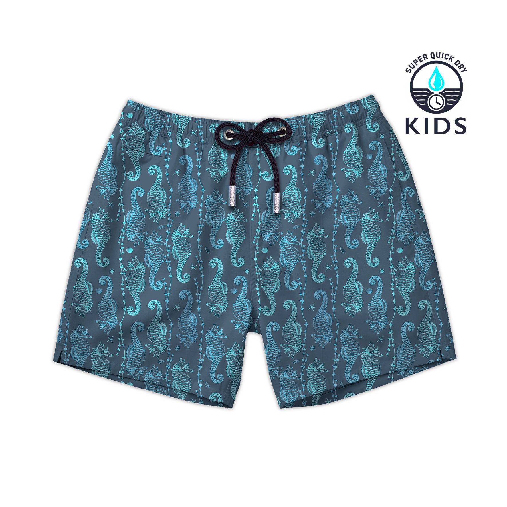 Traje de baño de secado ultra rápido con estampado de caballitos de mar sobre fondo azul marino.