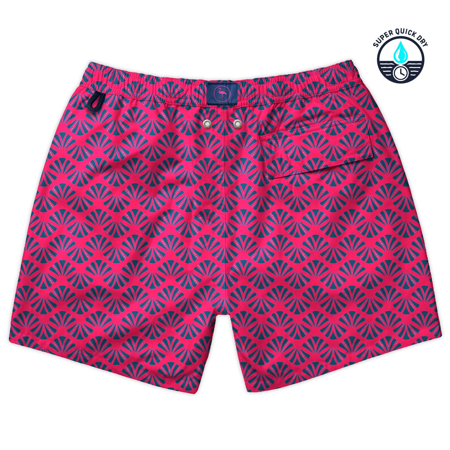 Traje de baño de secado ultra rápido con estampado de conchas azul marino sobre fondo rojo fresa. Cuenta con evacuadores de agua y terminales personalizados.
