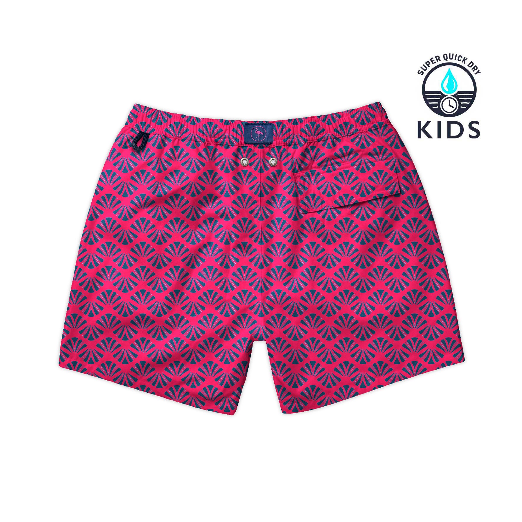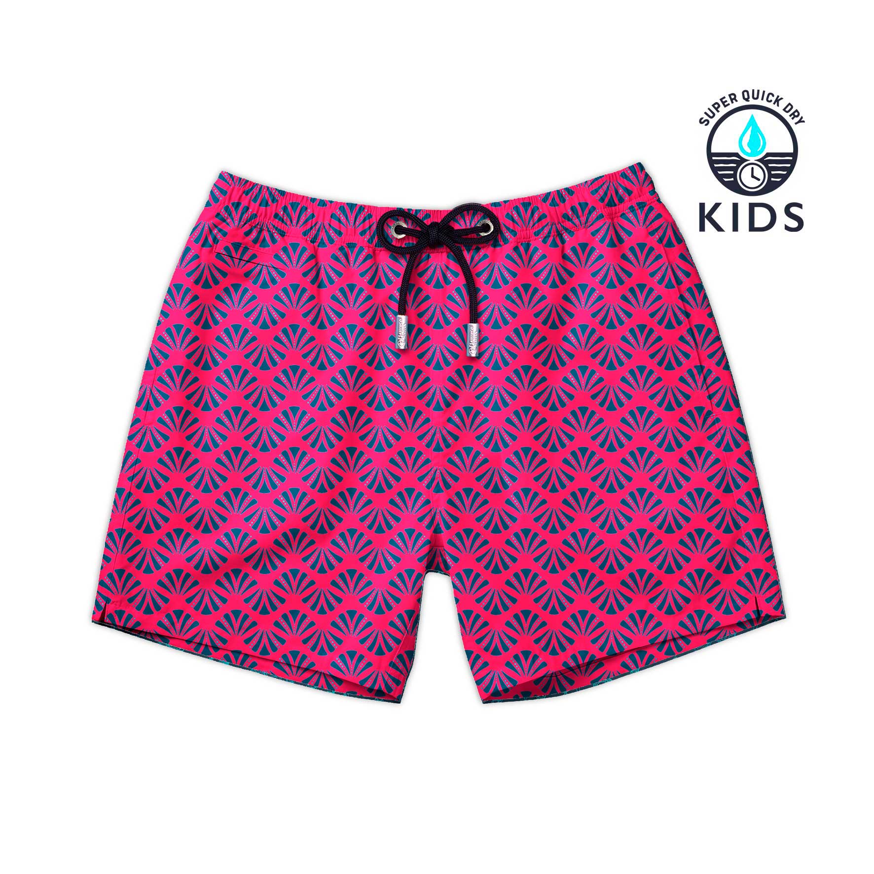 Traje de baño de secado ultra rápido con estampado de conchas azul marino sobre fondo rojo fresa. Cuenta con evacuadores de agua y terminales personalizados.